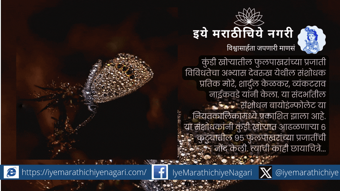 रत्नागिरी – कुंडी खोऱ्यातील फुलपाखरांच्या प्रजाती विविधतेचा अभ्यास देवरुख येथील संशोधक प्रतिक मोरे, शार्दुल केळकर, प्रताप व्यंकटराव नाईकवडे यांनी केला. या संदर्भातील संशोधन बायोइंन्फोलेट या नियतकालिकामध्ये प्रकाशित झाला आहे. या संशोधकांनी कुंडी खोऱ्यात आढळणाऱ्या ६ कुटुंबातील ९५ फुलपाखरांच्या प्रजातींची नोंद केली. यामध्ये निम्फॅलिडे हे ३५ प्रजातींसह प्रमुख कुटुंब असल्याचे आढळून आले; त्यानंतर लायकेनिडे २७, हेस्पेरिडे १५, पिएरिडे ९, पॅपिलिओनिडे ८ आणि रिओडिनिडेची फक्त एक प्रजाती नोंदीचा समावेश आहे. अभ्यास क्षेत्र फुलपाखरांनी आणि त्यांच्या विविधतेने समृद्ध असल्याचे आढळून आले.
