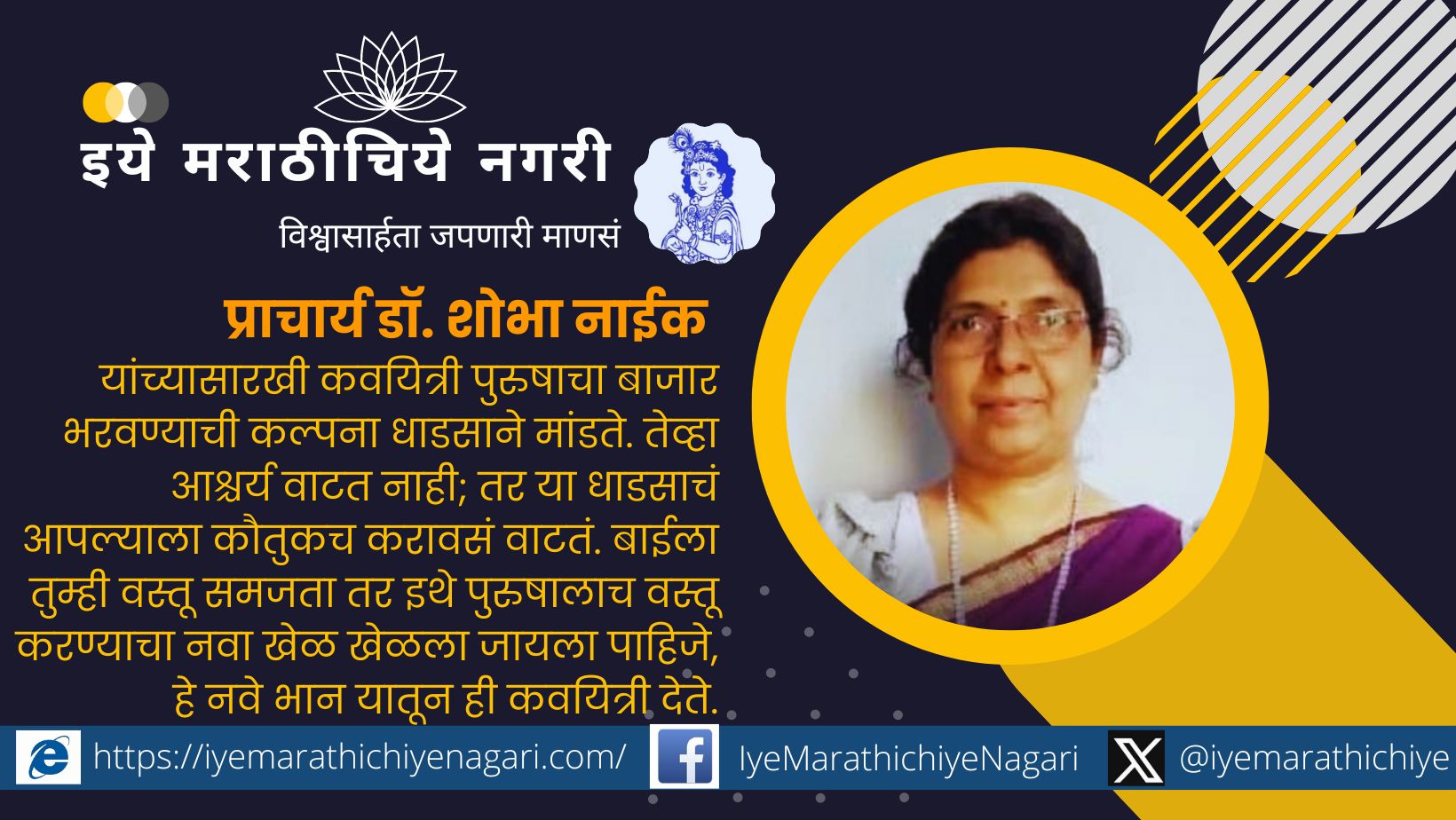शोभा नाईक यांच्यासारखी कवयित्री पुरुषाचा बाजार भरवण्याची कल्पना धाडसाने मांडते. तेव्हा आश्चर्य वाटत नाही; तर या धाडसाचं आपल्याला कौतुकच करावसं वाटतं. बाईला तुम्ही वस्तू समजता तर इथे पुरुषालाच वस्तू करण्याचा नवा खेळ खेळला जायला पाहिजे, हे नवे भान यातून ही कवयित्री देते.