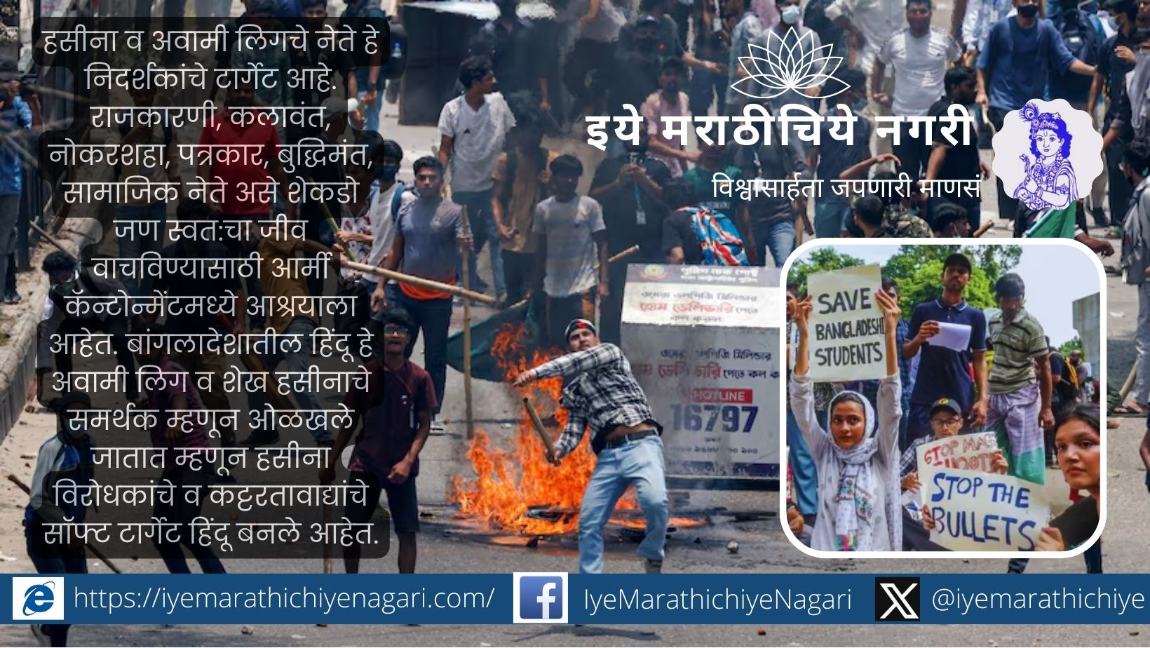 हसीना व अवामी लिगचे नेते हे निदर्शकांचे टार्गेट आहे. राजकारणी, कलावंत, नोकरशहा, पत्रकार, बुद्धिमंत, सामाजिक नेते असे शेकडो जण स्वत:चा जीव वाचविण्यासाठी आर्मी कॅन्टोन्मेंटमध्ये आश्रयाला आहेत. बांगलादेशातील हिंदू हे अवामी लिग व शेख हसीनाचे समर्थक म्हणून ओळखले जातात म्हणून हसीना विरोधकांचे व कट्टरतावाद्यांचे सॉफ्ट टार्गेट हिंदू बनले आहेत. बांगलादेशच्या बांगला व इंग्रजी वृत्तपत्रांतूनही हिंदूंवर होणाऱ्या हल्ल्यांची आकडेवारी प्रसिद्ध झाली आहे.