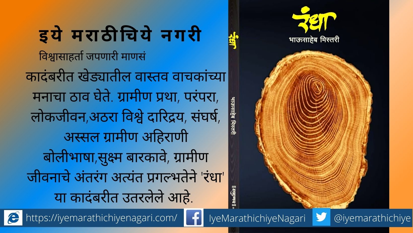 शब्दान्वय प्रकाशनाने नुकतीच प्रकाशीत केलेली आत्मकथनात्मक भाऊसाहेब मिस्तरी यांची रंधा ही कादंबरी वाचण्यात आली .या कादंबरीत खेड्यातील वास्तव वाचकांच्या मनाचा ठाव घेते. ग्रामीण प्रथा, परंपरा, लोकजीवन,अठरा विश्वे दारिद्रय, संघर्ष, अस्सल ग्रामीण अहिराणी बोलीभाषा,सुक्ष्म बारकावे, ग्रामीण जीवनाचे अंतरंग अत्यंत प्रगल्भतेने ‘रंधा’ या कादंबरीत उतरलेले आहे. खेडयातील समाजजीवन रुढी, परंपरा सनवार यांचे तपशीलवार वर्णन खेडं साक्षात उभं करतात. माझीही जडणघडण खेडेगावातील असल्याने व विशेषतः सुताराचे व माझे घर- अंगण एकच असल्याने (आत्तापण आहे ) सुतार कामाशी, त्याच्या जीवनाशी हत्यारे, अवजारांशी जवळून परिचित आहे. सुताराच्या कार्याशी निगडित काही हजारांची नावे वानगीदाखल सादर करतो उदा.( अंभोर , आरगडा, खतावणी, करवत, कानस, कैवार , कचरा, गिरमिट, चिरणं, ठिय्या , दातवाकी, पटाशी, माथकडी, रंधा व बरेच काही ) ‘रंधा’ मध्ये वर्णन केलेल्या घटना किंवा सन यांचे वर्णन वाचतांना सुताराचा कामठा व बालपण डोळ्यासमोर उभं राहतं .धुळे शहराच्या दक्षिणेला सतरा किलोमीटरवर मुंबई – आग्रा महामार्गावर वसलेलं ‘आर्वी’ या गावातील लेखक भाऊसाहेब मिस्त्री यांच्या जीवनातील जडणघडण ‘रंधा’ या कादंबरीत त्यांनी चितारलेली आहे .