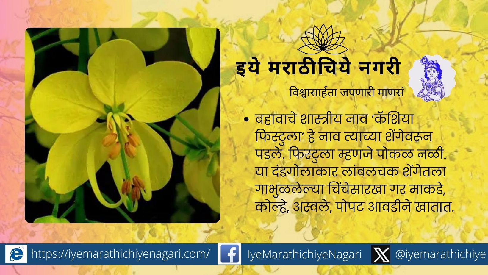बहावाचे शास्त्रीय नाव ‘कॅशिया फिस्टुला’ हे नाव त्याच्या शेंगेवरून पडले. फिस्टुला म्हणजे पोकळ नळी. या दंडगोलाकार लांबलचक शेंगेतला गाभुळलेल्या चिंचेसारखा गर माकडे, कोल्हे, अस्वले, पोपट आवडीने खातात.
