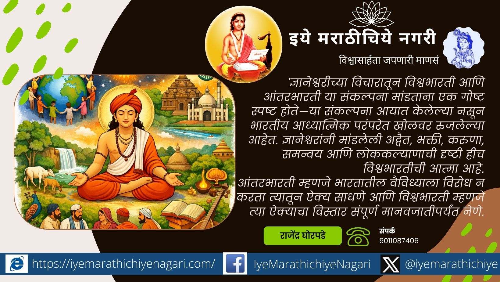 ‘विश्वभारती’ ही संकल्पना आज जागतिकीकरणाच्या संदर्भात मांडली जाते. विविध राष्ट्रे, भाषा, संस्कृती, धर्म आणि जीवनपद्धती असूनही मानवजातीचा मूलभूत आत्मा एकच आहे, ही भावना तिच्या मुळाशी आहे. ज्ञानेश्वरीत ही दृष्टी अत्यंत सहज आणि सुलभ शब्दांत मांडलेली दिसते. ज्ञानदेव म्हणतात—