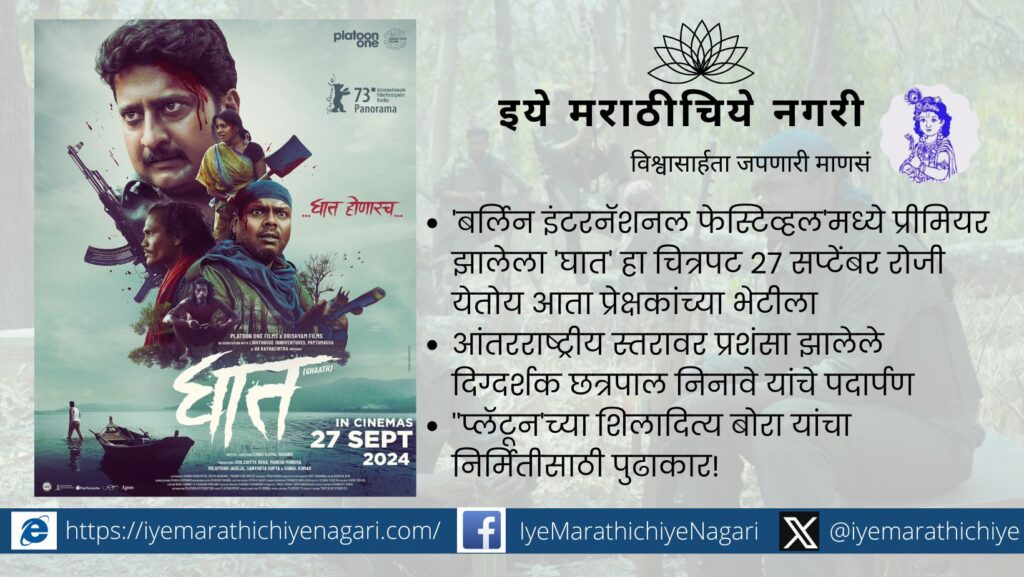 मुंबई : अत्यंत प्रतिष्ठेच्या अशा बर्लिन फिल्म फेस्टिव्हलमध्ये ज्याचा वर्ल्ड प्रीमियर दिमाखात पार पडला तो, छत्रपाल निनावे यांचा ‘घात’ हा मराठी सिनेमा आता महाराष्ट्रातल्या थिएटरमध्ये प्रदर्शित होतो आहे. माओवादी बंडखोरांनी घेरलेल्या जंगलात हा सिनेमा आकाराला येतो. माओवादी बंडखोर, सामान्य नागरिक, पोलिस यांच्यातील तणावपूर्ण आणि रहस्यपूर्ण पार्श्वभूमीवर सिनेमा रंगत जातो.