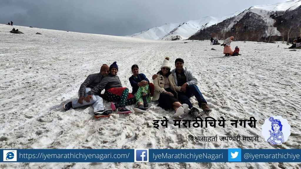 आजवर टीव्हीतील जाहिरातींमध्ये आणि चित्रपटात पाहिलेल स्कीईंग आम्ही आज करत होतो. हा अवर्णनीय आनंद होता. हे सगळं झाल्यावर केवळ फोटोसेशन करण्यासाठी दुसरा मदतनीस आपली स्कीईंगची साधनं घेवून हजर झाला. त्यांने सुचवलेल्या पोजवर मनमुरादपणे छबी टीपून झाल्यानंतर आम्ही सर्वजण पर्वताच्या पायथ्याशी दूरवर पसरलेल्या बर्फात मार्गक्रमण केले.