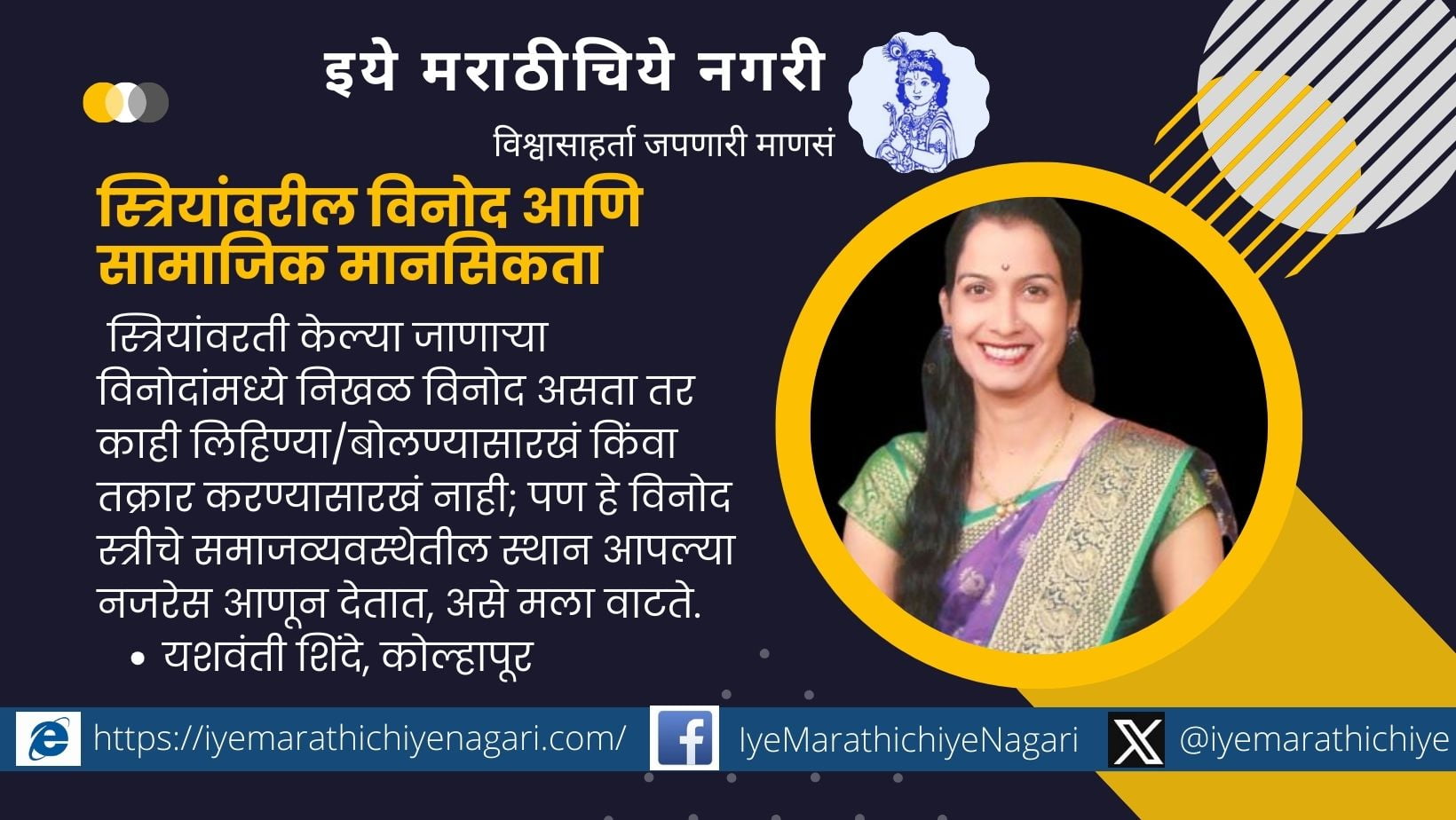 समाजजीवनात आपण नेहमी असे पाहत असतो. बर्याचदा स्त्रीची, पत्नीची चेष्टा/कुचेष्टा होते. कारण काहीही चालतं. पुरुषाची/पतीचीही चेष्टा होते; नाही असं नाही, पण दुय्यम दर्जाचे विनोद स्त्रियांवरतीच केले जातात. ना त्याला आड असते ना बूड. बर्याचदा विनोदाच्या माध्यमातून स्त्रियांचा अपमान केलेला असतो. कधी तिला अक्कल कमी असते, असं सुचवायचं असतं. उदा. काही महिन्यांपूर्वी महाराष्ट्र शासनाने स्त्रियांसाठी राज्य परिवहन मंडळाच्या बसेसमध्ये अर्धे तिकीट अशी सवलत जाहीर केली आणि ती सुरूही झाली. स्त्रियांसाठी शासनाने अशी सवलत द्यावी, अशी मागणी स्त्रियांनी कधीही केली नव्हती; पण या निर्णयावरूनसुद्धा स्त्रियांवर विनोद करण्याचे पीक आले. अक्कल कमी असते म्हणून हाफ तिकीट वगैरे विनोदांचा सोशल मीडियावर पाऊस पडू लागला.