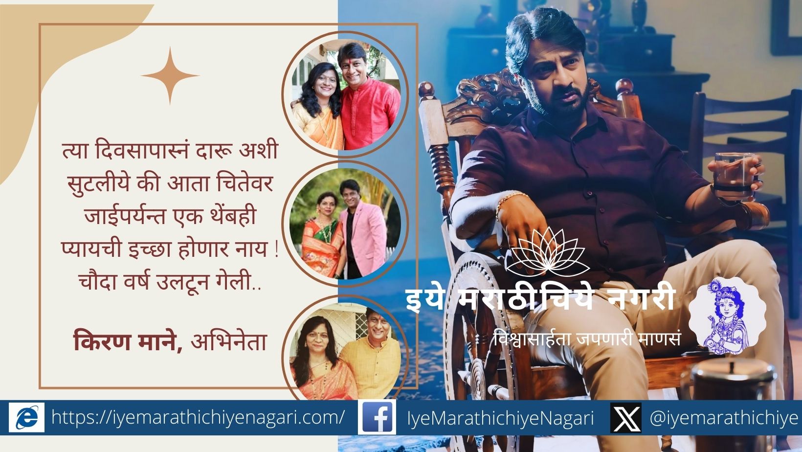 दूसरा किस्सा.. नंतर पाचसहा महिन्यानंतर लता नार्वेकरांचा फोन आला, “अरे किरण, मला तू ‘मायलेकी’ नाटकासाठी हवा आहेस. मी तुला पंधरा दिवसांपूर्वीच फोन करणार होते, पण मला कुणीतरी सांगीतले की ‘त्याला घेऊ नका. तो खूप पितो’..मी मंगेश कांबळीला फोन केला. तर मंगेश म्हणाला ‘छे ! मी महिनाभर त्याच्यासोबत इंग्लंडमध्ये होतो. आमच्या टीममध्ये दारूच्या थेंबालाही स्पर्श न करणार्यांत किरण माने होता.’ मग माझी खात्री पटली. तू माझ्या नाटकात काम करशील का?”