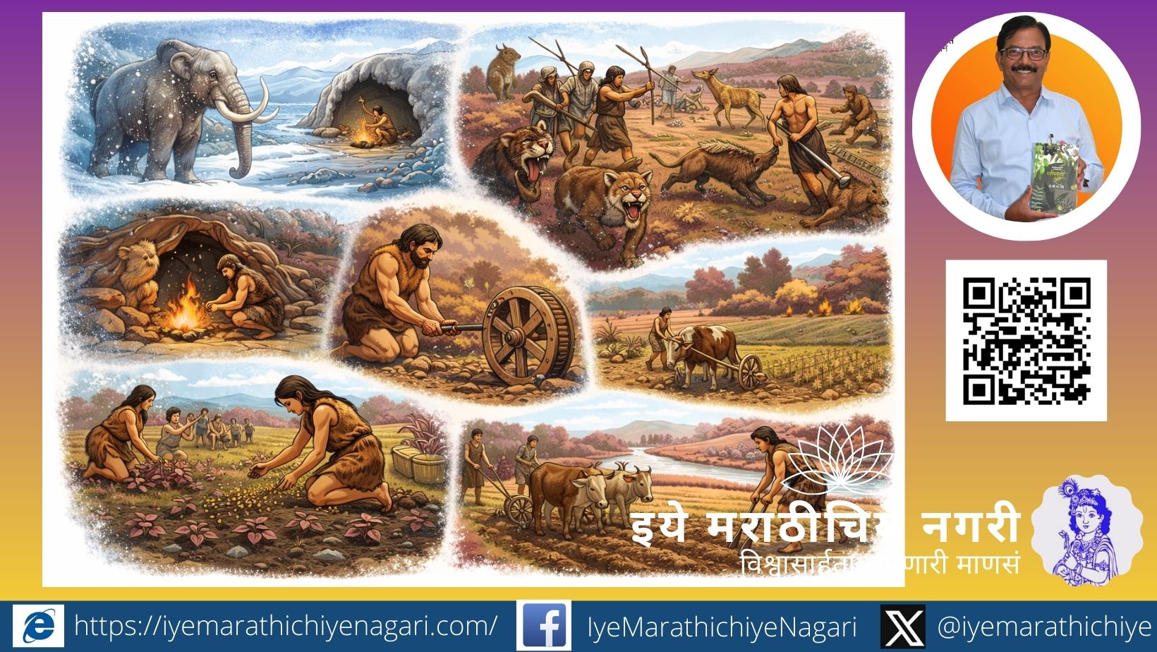 हिमयुगाच्या अस्तानंतर पाषाण युगाची सुरुवात झाली. हिमयुगाच्या काळात माणसापुढे, मानवाच्या पूर्वजापुढे अनेक संकटे ‘आ’ वासून उभा होती. जंगली प्राणी कधी हल्ला करतील आणि जीव घेतील याची चिंता होती. दुसरे म्हणजे बर्फ इतक्या मोठ्या प्रमाणात पडत होते की थंडीपासून स्वत:चा जीव वाचवणे कठीण झाले होते. तत्कालीन मानवाच्या अंगावरही, शेळ्या-मेंढ्याच्या अंगावर असतात, तसे केस होते. ते थंडीपासून वाचण्यासाठी पुरेसे नव्हते. जंगली प्राण्यांना भिती घालण्यासाठी अग्नीचा वापर करायला आदिमानव शिकला होता. आणखी एक महत्त्वाचे आव्हान होते, ते भूक मिटवण्याचे. त्यासाठी तो रोज सकाळी उठून, टोळीने बाहेर पडून शिकार करत असे. शिकारीसाठी हाताचा वापर जास्त होत असे.