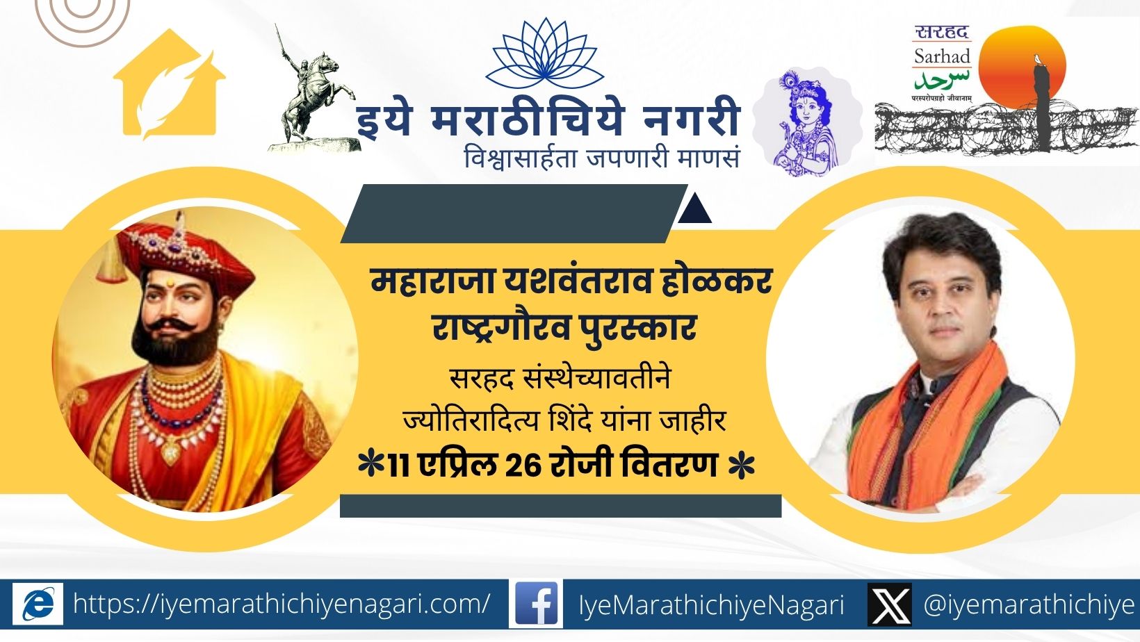 दिल्ली: महाराजा यशवंतराव होळकर यांच्या 250 व्या जयंती वर्षानिमित्त विशेष “महाराजा यशवंतराव होळकर राष्ट्रगौरव पुरस्कार” भारत सरकारचे केंद्रीय मंत्री ज्योतिरादित्य माधवराव शिंदे यांना प्रदान करण्यात येणार आहे. सरहद संस्थेच्यावतीने मुख्यमंत्री देवेंद्र फडणवीस यांच्या हस्ते हा सन्मान प्रदान केला जाणार आहे.
