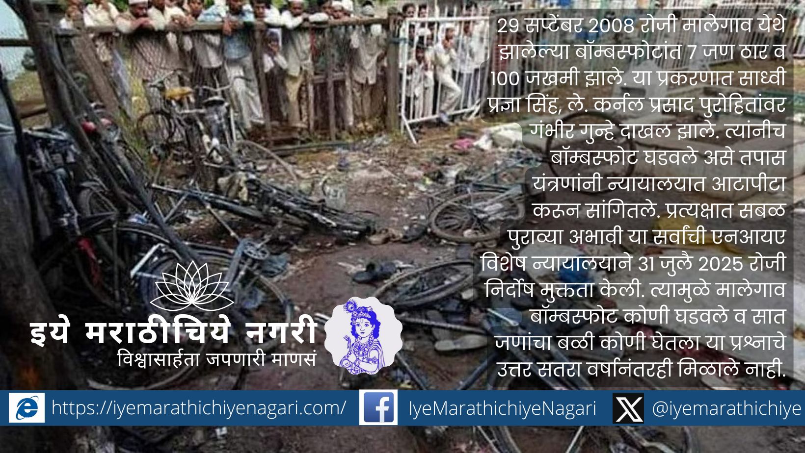 २९ सप्टेंबर २००८ रोजी मालेगाव येथे झालेल्या बॉम्बस्फोटांत ७ जण ठार व १०० जखमी झाले. या प्रकरणात स्थानिक पोलीस, एटीएस आणि एनआयए अशा तीन तपास यंत्रणांनी आपले सर्वस्व पणाला लावले. सखोल तपास करून चौदा जणांना अटक केली. साध्वी प्रज्ञा सिंह, ले. कर्नल प्रसाद पुरोहितांवर गंभीर गुन्हे दाखल झाले. त्यांनीच बॉम्बस्फोट घडवले असे तपास यंत्रणांनी न्यायालयात आटापीटा करून सांगितले. प्रत्यक्षात सबळ पुराव्या अभावी या सर्वांची एनआयए विशेष न्यायालयाने ३१ जुलै २०२५ रोजी निर्दोष मुक्तता केली. त्यामुळे मालेगाव बॉम्बस्फोट कोणी घडवले व सात जणांचा बळी कोणी घेतला या प्रश्नाचे उत्तर सतरा वर्षानंतरही मिळाले नाही.