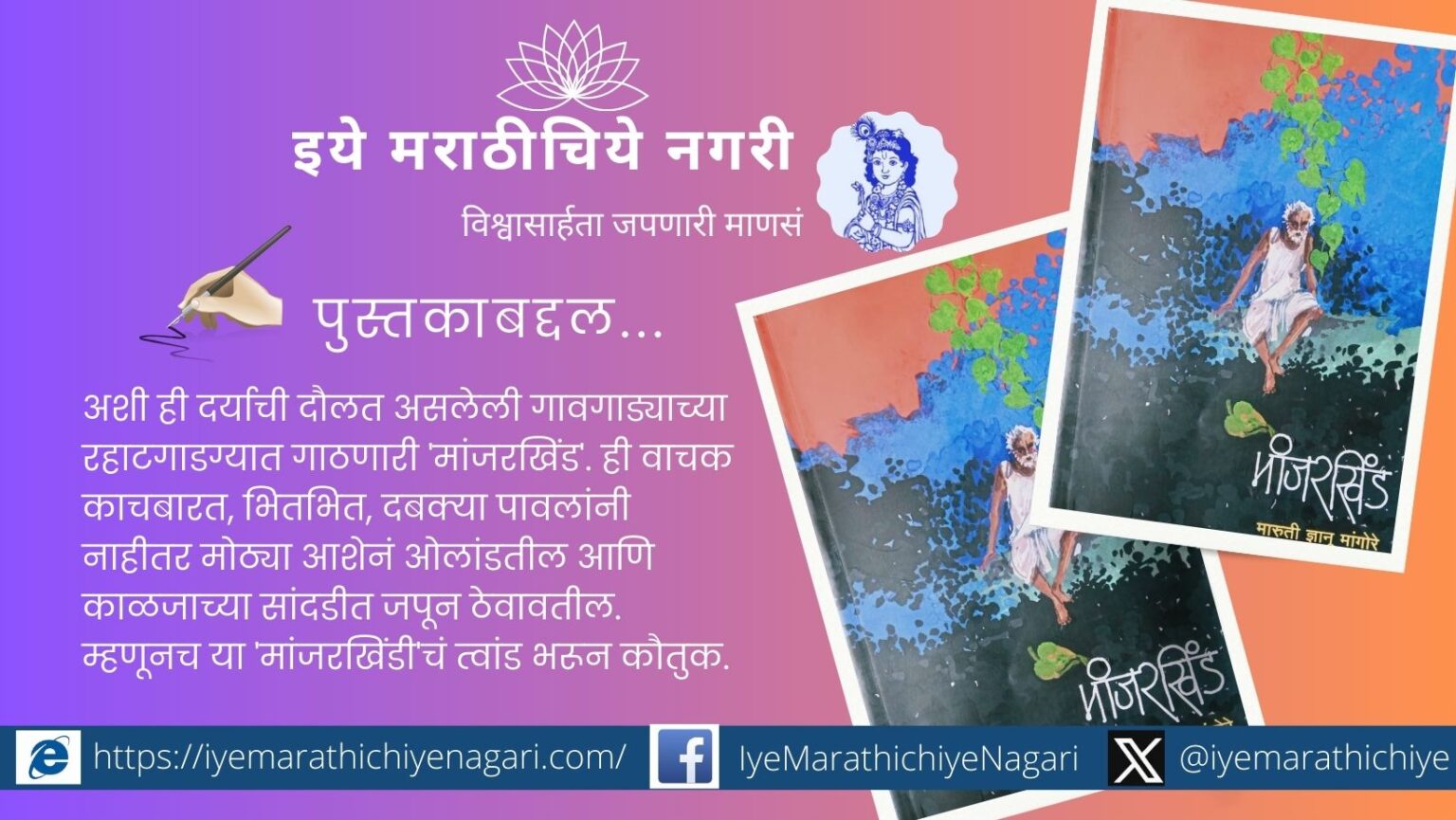 अशी ही दर्याची दौलत असलेली गावगाड्याच्या रहाटगाडग्यात गाठणारी ‘मांजरखिंड’. ही वाचक काचबारत, भितभित, दबक्या पावलांनी नाहीतर मोठ्या आशेनं ओलांडतील आणि काळजाच्या सांदडीत जपून ठेवावतील. म्हणूनच या ‘मांजरखिंडी’चं त्वांड भरून कौतुक. रवींद्र शिवाजी गुरव, 9822254047 मांजरखिंड ही ज्येष्ठ साहित्यिक मित्र मारुती ज्ञानू मांगोरे यांची गावपण शाबूत ठेवणारी बहुचर्चित पहिलारू कादंबरी दर्या … Continue reading गावगाड्याच्या रहाटगाडग्यात आदरून गाठणारी ‘मांजरखिंड’
