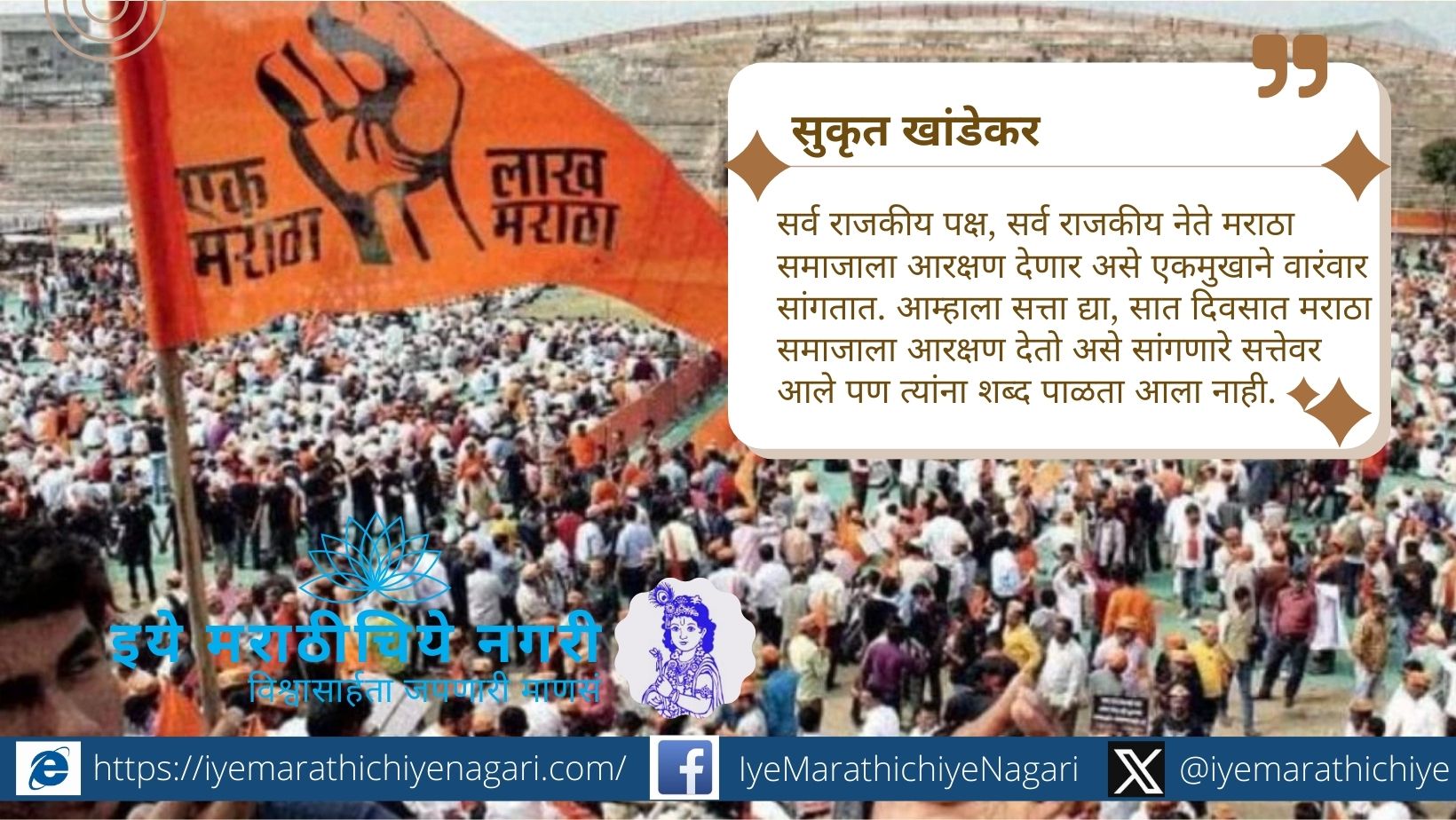 उपमुख्यमंत्री एकनाथ शिंदे हे मुख्यमंत्री असताना पावणे दोन वर्षापूर्वी मराठा समाजाला आरक्षण देण्याचा निर्णय सरकारने घेतला होता व मुंबईच्या वेशीवर जाऊन त्या निर्णयाचा जीआर मनोज जरांगे यांच्या हाती सोपवला होता, तेव्हा आरक्षणाची लढाई जिंकल्याच्या थाटात आंदोलकांनी जल्लोश केला होता. मग मनोज जरांगे यांना आरक्षणाच्या मागणीसाठी पुन्हा मुंबईला का यावे लागले ? मराठा समाजाला सरसकट कुणबी प्रमाणपत्र जारी करण्यात यावे ही जरांगेपाटील यांची प्रमुख मागणी आहे. सगे सोयरे मसुदा अंमलात आणावा, यासाठी त्यांचा आग्रह आहे.
