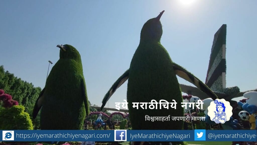 अगदी खरोखरीचं चक्क विमानच बागेत ठेवलं असून, त्यावरही फुलांची झाडे वाढवली आहेत. हे वेगळंच आकर्षण होय. हिरवाळलेले मोठाले उभे पेंग्विन, फुलांची घरे, भोवताली मिनार, विविधरंगी छत्र्यांच्या सजावटीच्या कमानी, जागोजागीचे पाण्याचे झरे, प्रपात, छोटेखानी तलाव, हत्ती, फुलपाखरांच्या प्रतिकृतीतून फुलांचा फुलोरा सारंच कसं वाळवंटी उष्म्यात सुखद गारवा देणारं नयनरम्य, आल्हाददायक होतं. हे सारं डोळ्यातून मनाच्या कप्प्यात बंदिस्त करतानाच आठवणी जपण्यासाठी मोबाईलच्या कॕमेऱ्यातही बंदिस्त होतं होतं.