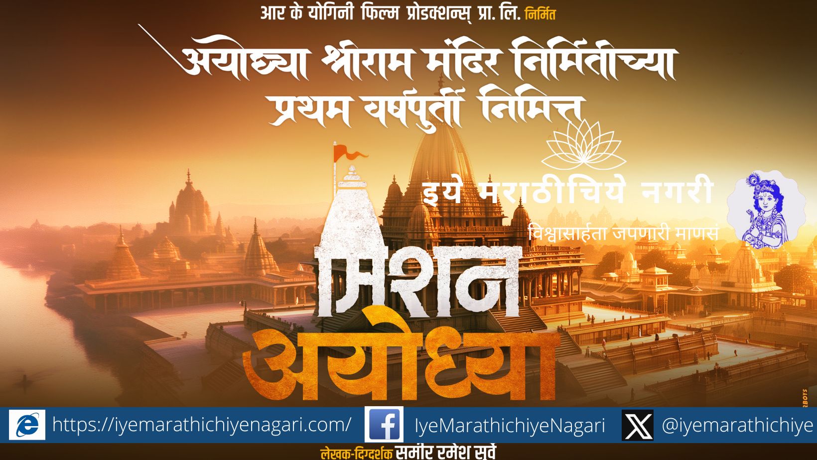 मुंबई: दिवाळीच्या मंगलमय वातावरणात, मराठी चित्रपटसृष्टीतील एका अत्यंत महत्त्वाकांक्षी चित्रपटाने विलक्षण कुतूहल निर्माण केले आहे. समीर रमेश सुर्वे लिखित – दिग्दर्शित आणि निर्माते कृष्णा दादाराव शिंदे, योगिता कृष्णा शिंदे यांच्या ‘आर के योगिनी फिल्म्स प्रॉडक्शन प्रा. लि.’ निर्मित ‘मिशन अयोध्या’ या चित्रपटाच्या महाराष्ट्रातील प्रदर्शनाची तारीख दिवाळीच्या मंगलमय मुहूर्तावर जाहीर करण्यात आली. येत्या वर्षात २३ जानेवारी २०२४ रोजी हा चित्रपट संपूर्ण महाराष्ट्रात प्रदर्शित होणार आहे. या चित्रपटाचे शीर्षक जाहीर होताच त्याने सर्वांचे लक्ष वेधले असून त्याच्या प्रदर्शनाची उत्सुकता आता शिगेला पोहोचली आहे.