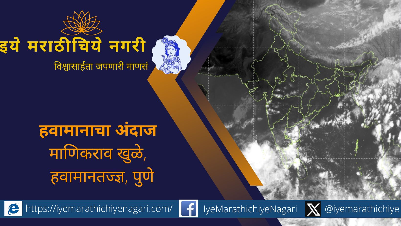 शनिवार दि. २५ ऑक्टोबर दरम्यान आग्नेय बंगाल उपसागरात कमी दाब क्षेत्र निर्मिती व त्याचे पश्चिमेकडे मार्गक्रमणातून संपूर्ण महाराष्ट्रात त्यातही विशेषतः कोल्हापूर, सातारा, सांगली, सोलापूर, धाराशिव, लातूर ह्या जिल्ह्यात ऑक्टोबरच्या शेवटच्या आठवड्यात मध्यम पावसाची शक्यता जाणवते.