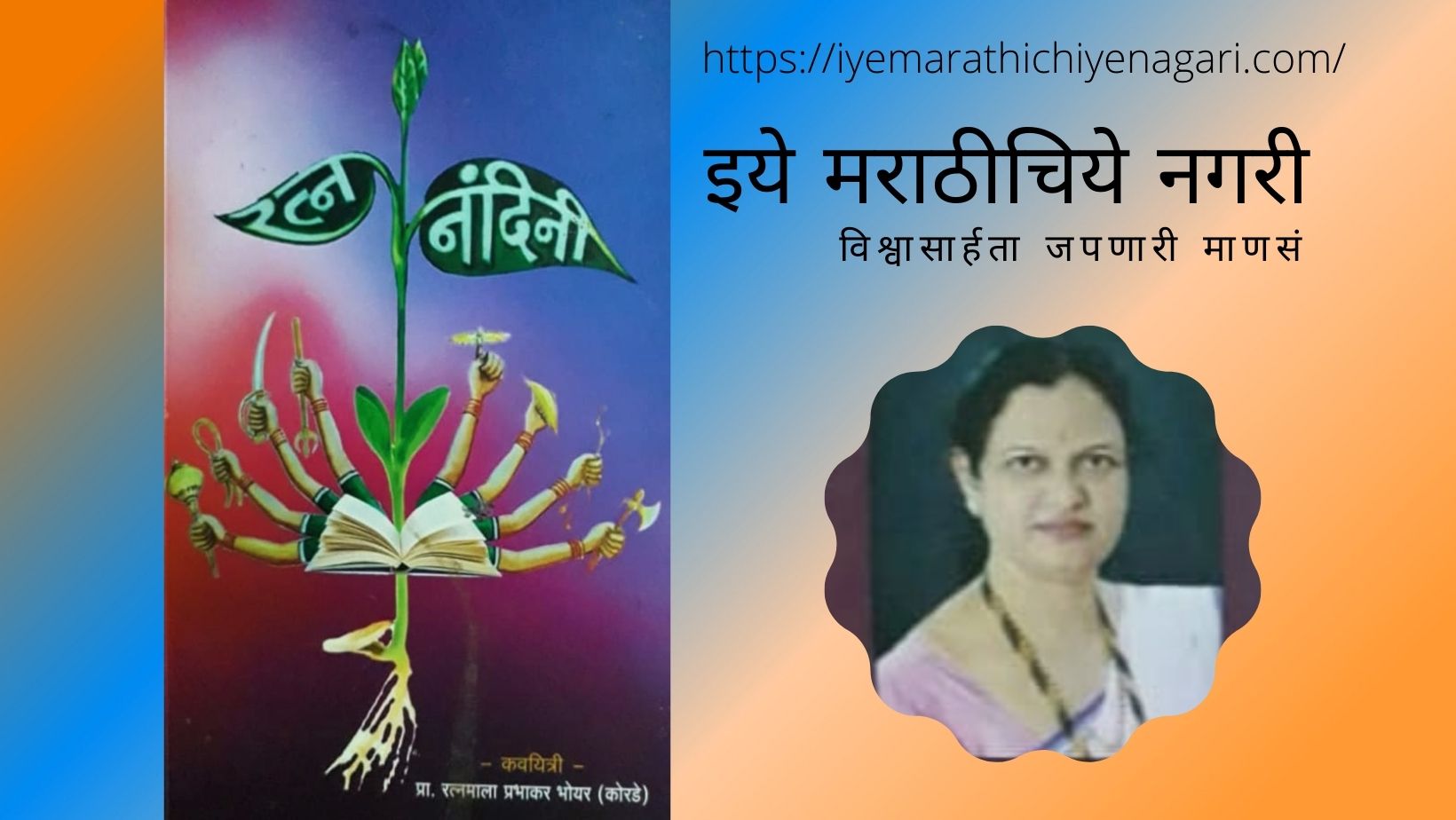मुल (जि. चंद्रपुर) येथील माजी नगराध्यक्ष प्रा. रत्नमाला प्रभाकर भोयर यांचा रत्ननंदिनी हा काव्यसंग्रह वाचतांना आनंद होतोय. तीन वर्षांपूर्वी त्यांची भेट बालविकास शाळा मूल येथे आयोजीत झाडीबोली साहित्य मंडळाच्या वार्षिक कार्यक्रमात झाली होती, त्यावेळी झालेल्या कविसंमेलनात त्यांनी आपल्या रचना सादर केल्या होत्या. त्या रचना ऐकल्यावर आपण काव्यसंग्रह काढावा, असे मी त्यांना सुचवले होते. पुढे त्या गडचिरोली येथे आयोजीत ‘आपली माणसं आपले शब्द ‘ या प्रातिनिधिक काव्यसंग्रहाच्या प्रकाशनाच्या निमित्ताने कार्यक्रमात सहभागी झाल्या होत्या. झाडीबोली साहित्य मंडळाच्या व्हॉट्सअप ग्रुप त्यांनी पोस्ट केलेल्या अनेक रचना मी वाचलेल्या आहे. त्या साऱ्या
