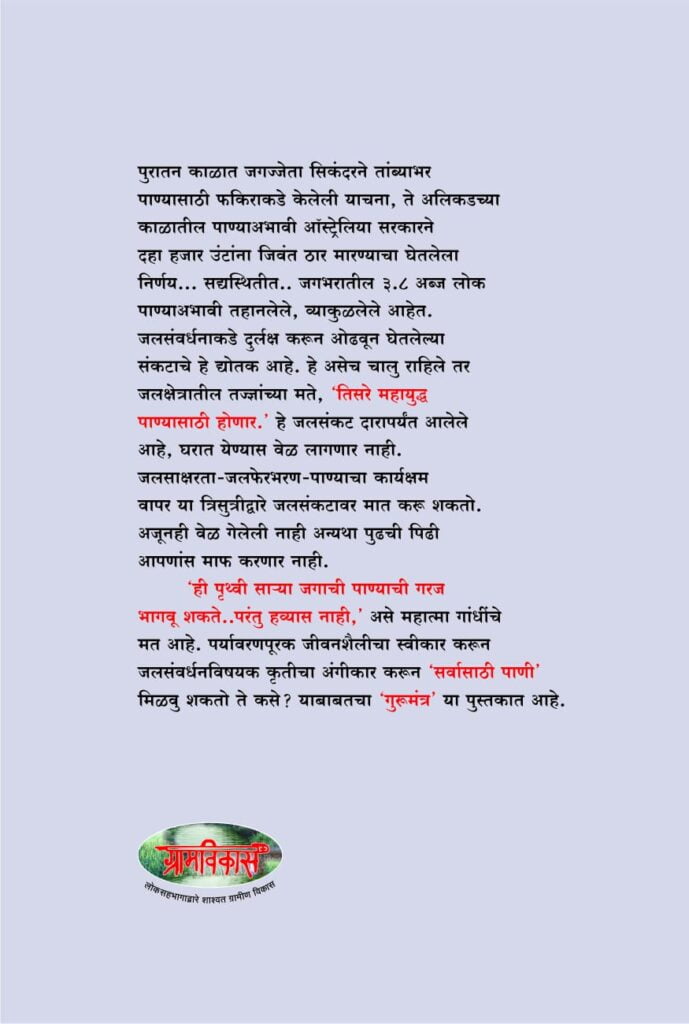पाणी प्रश्नांचा मुळापासून शोध घेणारे, जिज्ञासापूर्ती करणारे व प्रत्यक्ष कृती आराखड्यााची मांडणी करणारे हे पुस्तक सर्वसामान्यांनी या विषयात नेमके काय केले पाहिजे याचा वस्तुपाठ घालून देणारे आहे. मुख्य म्हणजे या पुस्तकात प्रत्येक प्रकरणाच्या शेवटी ‘‘महत्त्वपूर्ण’’ या मथळ्याखाली त्या त्या प्रकारांच्या सारांश सांगणारे थोडक्यात मुद्दे उद्घृत केलेले आहेत. तसेच ‘‘आपण हे करू शकता’’ याअंतर्गत सर्वसामान्यांनी नेमकी काय कृती करावी याची माहिती दिली आहे. प्रत्येक प्रकरणासोबत त्या विषयावरील तज्ञ व्यक्तीचे मत नोंदविले आहे. त्यामुळे लिखाणास वस्तुनिष्ठता आणि शास्त्रीय बैठक प्राप्त झालेली आहे. त्यात नेमकेपणा आला आहे. ज्यामुळे हा काहीसा क्लिष्ट असलेला विषय सर्वसामान्यांना समजण्यास व त्यानुसार कार्य करण्यास सोपा झाला आहे.