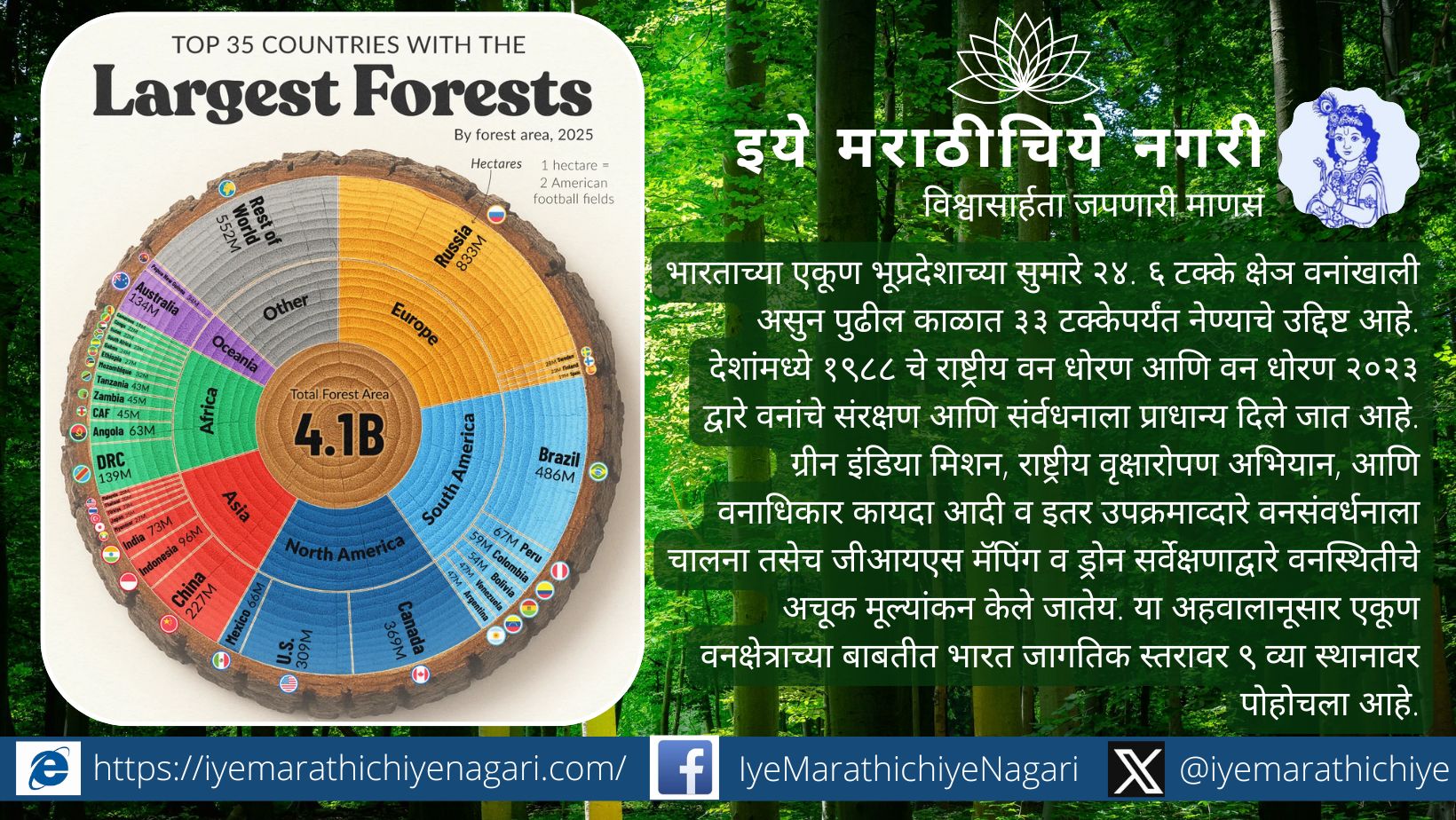 भारताच्या एकूण भूप्रदेशाच्या सुमारे २४. ६ टक्के क्षेञ वनांखाली असुन पुढील काळात ३३ टक्केपर्यंत नेण्याचे उद्दिष्ट आहे. देशांमध्ये १९८८ चे राष्ट्रीय वन धोरण आणि वन धोरण २०२३ द्वारे वनांचे संरक्षण आणि संर्वधनाला प्राधान्य दिले जात आहे. ग्रीन इंडिया मिशन, राष्ट्रीय वृक्षारोपण अभियान, आणि वनाधिकार कायदा आदी व इतर उपक्रमाव्दारे वनसंवर्धनाला चालना तसेच जीआयएस मॅपिंग व ड्रोन सर्वेक्षणाद्वारे वनस्थितीचे अचूक मूल्यांकन केले जातेय. या अहवालानूसार एकूण वनक्षेत्राच्या बाबतीत भारत जागतिक स्तरावर ९ व्या स्थानावर पोहोचला आहे. निव्वळ वार्षिक वनक्षेत्र वाढीच्या बाबतीत भारताने जागतिक स्तरावर तिसरे स्थान कायम राखत २०२१ ते २०२५ दरम्यान दरवर्षी १५० मेट्रिक टन कार्बन उत्सर्जन कमी करणाऱ्या देशांमध्ये पाचवे स्थान पटकावले आहे. ही बाब नक्कीच दखलपात्र आहे. एकंदरितच २०१५ ते २०२५ दरम्यान चीन, रशियन फेडरेशन आणि भारताच्या वनक्षेत्रात सर्वाधिक निव्वळ वार्षिक वाढ नोंदवली आहे. परंतू दिवसेंदिवस वाढते शहरीकरण, बदलती जीवनशैली, औद्योगिकीकरण, खनिज उत्खनन आणि हवामान बदल हे वनक्षेत्र वाढीला अडथळ्याचे ठरत आहे.