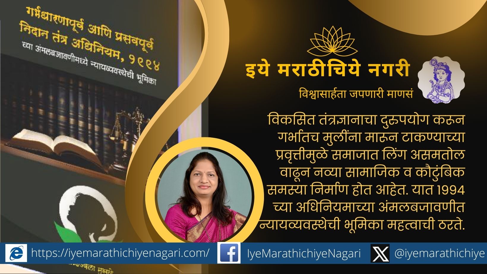 विकसित तंत्रज्ञानाचा दुरुपयोग करून गर्भातच मुलींना मारून टाकण्याच्या प्रवृत्तीमुळे समाजात लिंग असमतोल वाढून नव्या सामाजिक व कौटुंबिक समस्या निर्माण होत आहेत. यात १९९४ च्या अधिनियमाच्या अंमलबजावणीत न्यायव्यवस्थेची भूमिका महत्वाची ठरते. ती भूमिका समाजापर्यंत सोप्या भाषेत पोहोचवण्यात या पुस्तकाचे योगदान महत्वाचे आहे. तरी या कार्यक्रमाला महिला, विद्यार्थी, शिक्षक, नागरिक, विविध सामाजिक संस्थांचे पदाधिकारी यांनी उपस्थित राहावे, असे आवाहन लेखिका न्यायाधीश डॉ. उज्वला मुसळे, माजी मुख्याध्यापक टी. डी. मुसळे, चिपळूण वकील संघ, सामाजिक कार्यकर्ते प्रा. डॉ. गुलाबराव राजे यांनी केले आहे.