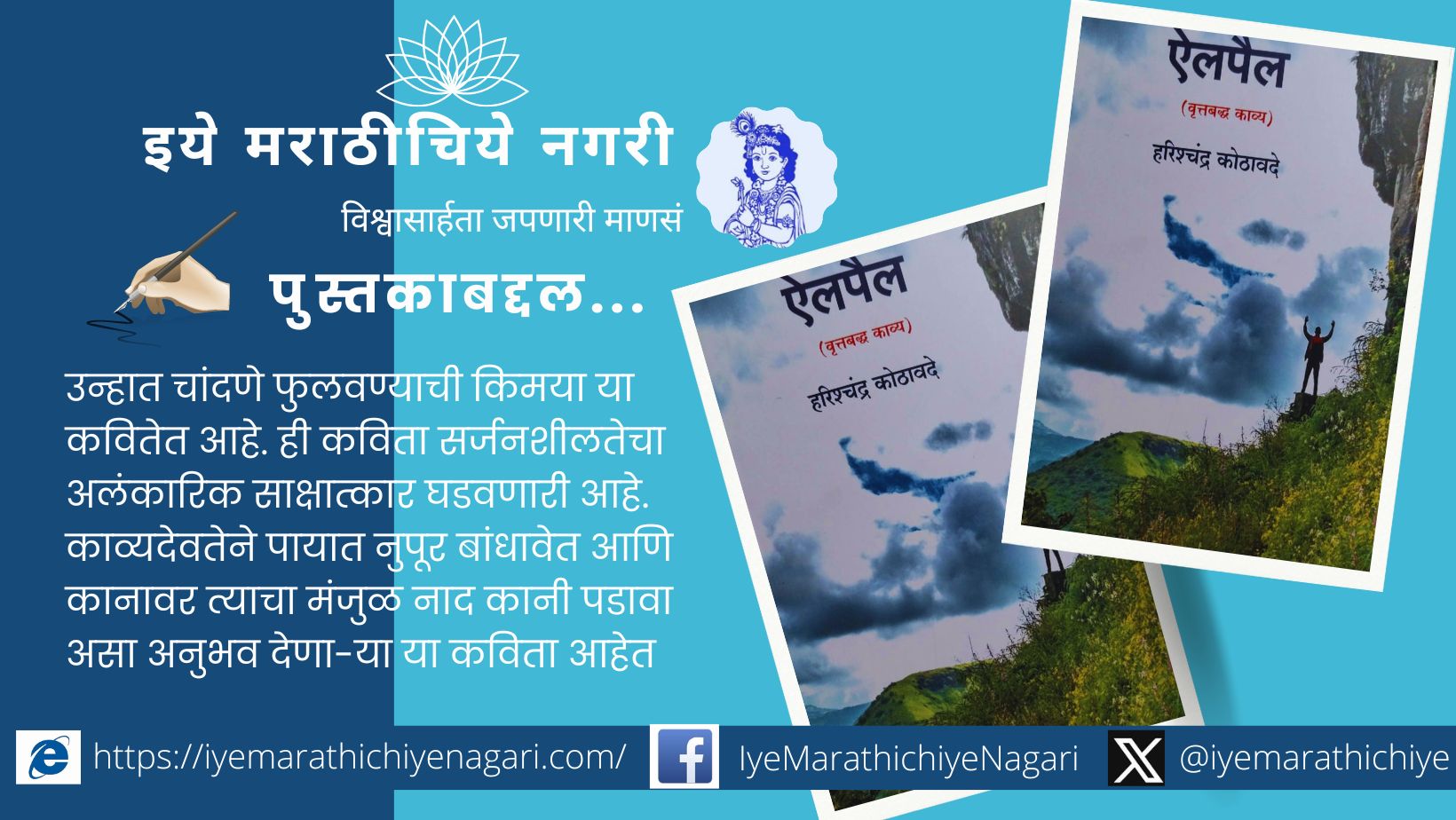 सुप्तकोषातील कवितेला जागृत करुन वृत्तबद्ध काव्याचा मधुघट हाती देणा-या हरिश्चंद्र कोठावदे यांचा ‘ ऐलपैल ‘ हा एकशेबावन्न कवितांच्या संग्रहाचा आस्वाद घेतल्यानंतर त्यातील काही अमृतकण रसिकांपर्यंत पोहोचावेत याहेतूने केलेले हे लेखन ! खरे तर प्रत्येक ओळीचा आस्वाद स्वतः घ्यावा असा हा काव्यसंग्रह. मुक्तछंदाची वाट न चोखाळता वृत्तबद्ध, छंदोबद्ध काव्यलेखन करणारे पुण्याचे श्री.कोठावदे यांनी या काव्यसंग्रहाद्वारे काव्यानंदाचा लाभ घडवून आणला आहे.