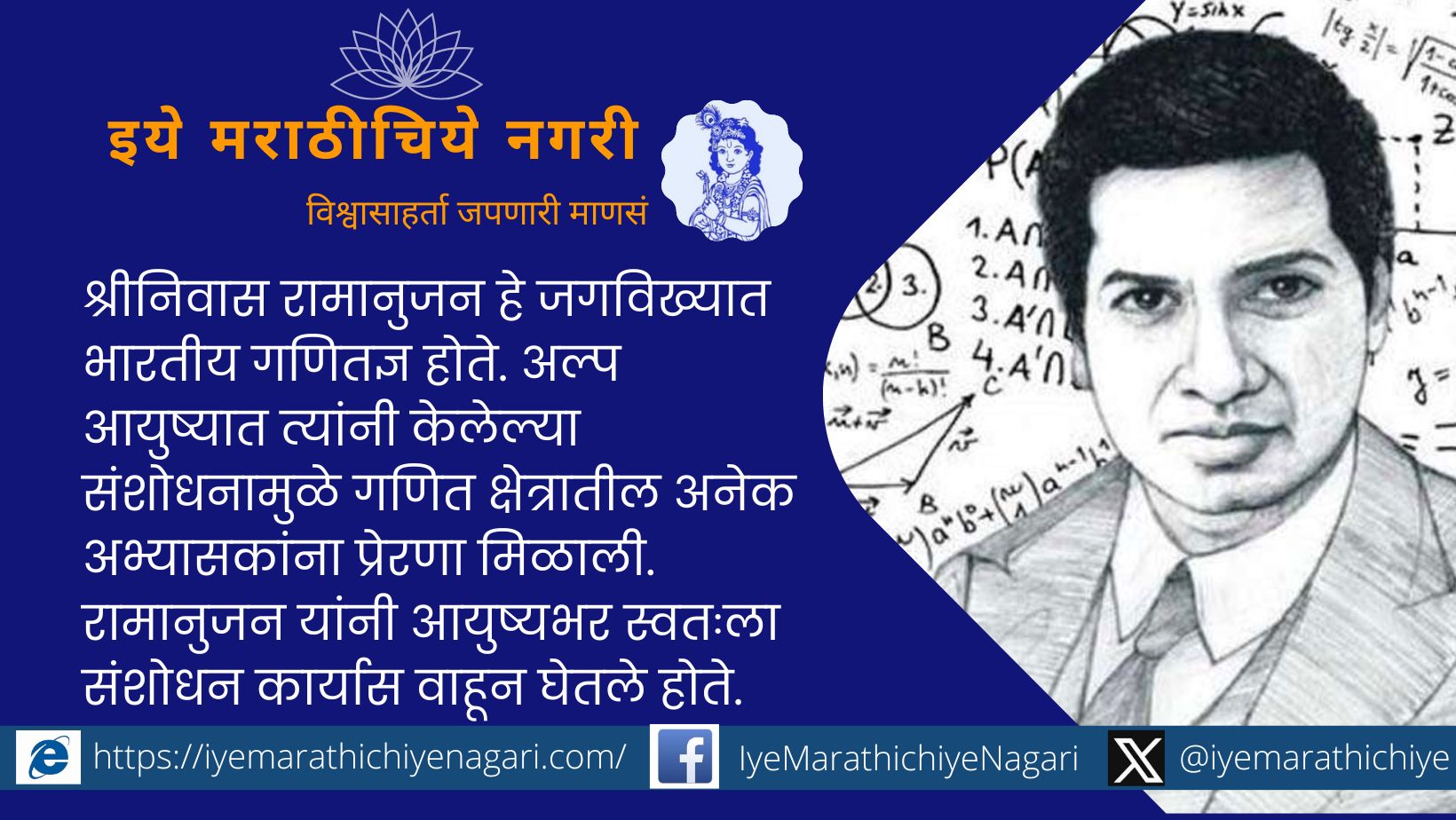 आपल्या भारत देशात अनेक लोकोत्तर पुरुष होऊन गेले, ज्यांनी विविध क्षेत्रांत भव्यदिव्य कार्य केले. संत नामदेवांसारख्यांना उदंड आयुष्य (८० वर्षे) लाभले, तर स्वामी विवेकानंदांसारखे अल्पायुष्यी (३९ वर्षे) ठरले; परंतु विवेकानंदांनी आपल्या अल्पायुष्यात जे कार्य केले त्याला तोड नाही. आणखी एक महान व्यक्ती, जिला फक्त ३३ वर्षे आयुष्य लाभले. ती व्यक्ती म्हणजे महान गणितज्ञ श्रीनिवास रामानुजन.