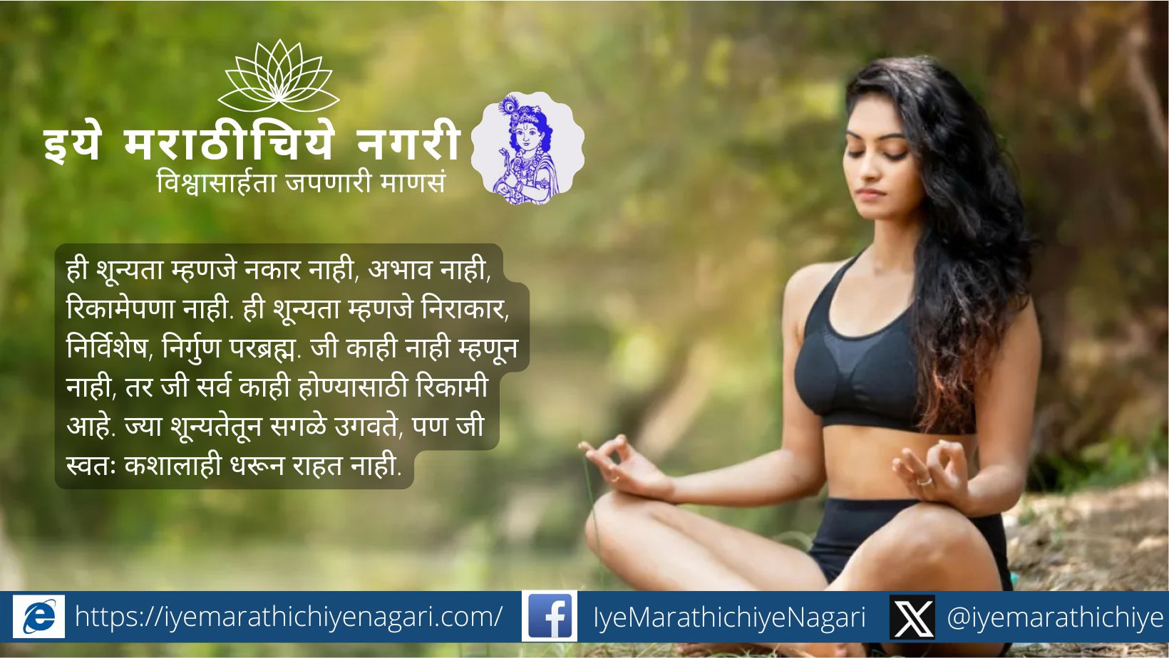 ज्ञानेश्वरी मात्र सांगते—शून्य ही भीतीची जागा नाही, तर विश्रांतीची जागा आहे. जिथे काही सिद्ध करायचे नाही, काही मिळवायचे नाही, काही टिकवायचे नाही. त्या शून्याशी एकरूप झाला की माणूस सहज होतो, मुक्त होतो.
